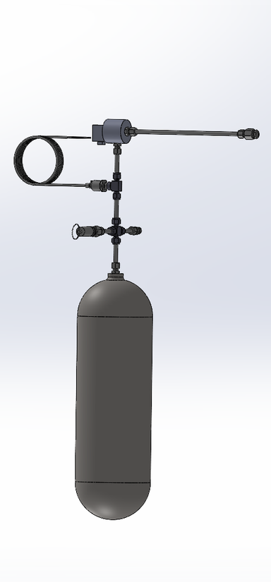 My job was to design a testing mechanism to calibrate the proper gas pressure and burst duration for the system. This mechanism had to accurately simulate the pressure losses in the piping from the pressure tank to the nozzle while also being modular and portable enough to make necessary modifications.
